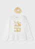 Camiseta color crudo manga larga para niña. Estampado de sandalias artesanales en la parte frontal. colero estampado en amarillo. Diseño atemporal y divertido.