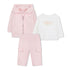 Conjunto de tres piezas en mezcla suave y premium. Cárdigan con capucha y cierre delantero con cremallera, acompañado de bordado tonal “MK” en el pecho. Camiseta 100% orgánica con broches en la espalda y diseño “MK Empire” rodeado de detalles dorados en efecto metálico. Pantalón con bolsillos de tapa laterales para un toque moderno y funcional.