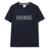 Camiseta azul de manga corta en algodón suave, con cuello redondo. Logotipo "BOSS" en gran formato se presenta con un sofisticado sombreado en contraste de tonos verdes en la parte frontal, aportando un toque moderno y distintivo.