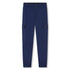 Pantalón holgado azul, forro interno de malla, cintura elástica con cremallera y cierre a presión, canesú en las piernas, bolsillos tipo cargo en los costados, estampado trenza en las solapas de los bolsillos, elástico en los tobillos.