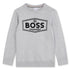 Sweater gris de niño cuello redondo, ilustración icónica y logo "BOSS" bordado en el pecho de la prenda.