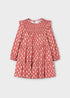 Vestido elaborado en tela viella estampada ofrece suavidad y movimiento, mientras que los detalles de volantes en los hombros le aportan un toque femenino y delicado. El cuello redondo con cierre de botón en la parte posterior permite vestirlo con facilidad. Ideal para los días frescos, cuenta con textura tipo rizo y diseño estampado que realza la elegancia infantil.