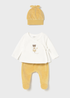 Encantador set de tres piezas para recién nacido en suave velvet color miel que combina confort y estilo premium. Incluye gorrito con lazo decorativo, camiseta cruzada con delicado bordado de hada que aporta un toque mágico y femenino, y pantalón tipo polaina con cintura elástica para máximo confort. Un look dulce y sofisticado inspirado en la ternura de los primeros días.