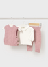 Set tipo tejido de 3 piezas para recién nacido. Compuesto por chaleco, jogger y una camiseta a juego. Chaleco tejido con broches en la parte delantera, broches en el hombro que facilita la puesta. Camiseta manga larga de cuello redondo con volante y broches a presión en la parte posterior. Legging con cinturilla elástica del mismo tejido del chaleco.