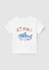 Camiseta de manga corta para bebé con cuello redondo y tejido 100% algodón. Serigrafía con diseño de tiburón, inspirada en la energía del mar y el surf, para un look lleno de carácter y frescura.