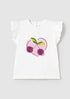 Camiseta de manga corta para bebé con delicados volantes. Cuello redondo y cierre con un único botón en la espalda. Serigrafía con apliques que aportan un toque tierno y especial. Una prenda esencial para looks dulces y cómodos.