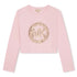 Camiseta manga larga con silueta cropped en color rosado para niña. Logotipo frontal MK Charm en impresión metálica con apliques dorados. Diseño casual y moderno. Prenda Must have de temporada.