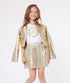 Vestido manga corta elaborado en la parte superior con interlock color blanco y la falda en plisado color dorado. Cintura con elástico dorado. Logotipo frontal MK Charm con lentejuela. Diseño moderno, elagante y versátil.