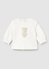 Camiseta de manga larga para recién nacida con volantes en los hombros. Cuello redondo. Cierre con botones a presión en la parte posterior. Modelo con rizo. Diseño de osito en serigrafía en la parte central.