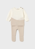 Elegante conjunto tricot de dos piezas para recién nacido que combina suavidad y diseño clásico. Incluye jersey de manga larga con cuello redondo y botones en el hombro para vestir con facilidad, tejido en punto tricotosa de tacto delicado con dibujos jacquard y bolsillos funcionales en la parte delantera. Completa el look una polaina con cinturilla elástica. Las tallas pequeñas de este modelo (0-0 a 4-6 meses) tienen cinturilla doble.