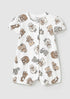 Enterizo manga corta para recién nacido, en suave mezcla de algodón. Cierre con broches en la parte delantera y entrepierna para facilitar la postura. Diseño estampado Cute Bear por toda la prenda. Delicado, cómodo y perfecto para los primeros días.