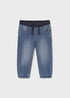 Jogger denim para bebé, holgado en la parte superior y más estrecho a medida que baja hacia el tobillo. Cinturilla elástica con cordón y bolsillos funcionales. Perfecto para looks sport, que reflejan la influencia de lo deportivo en la ropa de calle.