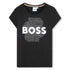 Camiseta negra de manga corta, ilustración de fantasía brillante y logotipo "BOSS" en flocado brillante en la parte frontal.