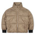 Chaqueta abullonada color camel, monograma en jacquard integral por toda la prenda, bolsillos laterales, cierre de cremallera en la parte delantera, cuello alto, puños acanalados en contraste.
