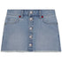 Falda jean azul con botones frontales, moderna y atemporal, 5 bolsillos, acabo de flecos cortos en la parte inferior, label de goma con logo en la parte posterior. Composición: Algodón | Elastano.