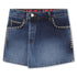 Falda pantalón denim 5 bolsillos, detalles de tachuelas a lo largo de los bolsillos delanteros, etiqueta con la marca en la parte posterior.