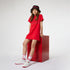 Vestido rojo de punto manga corta, cuello de canalé, logotipo "HUGO" rodeado de tachuelas en el frente.