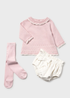 Conjunto de tres piezas para recién nacida que combina estilo y confort premium: suéter de manga larga con cuello redondo y botones posteriores para vestir con facilidad, braguita con delicados lunares coordinados y cinturilla elástica para máxima suavidad, y medias tupidas que completan un look elegante y exclusivo para tu bebé.