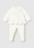 Delicado conjunto de dos piezas para recién nacida que combina elegancia y confort. Incluye camiseta de manga larga con cuello bebé, cierre posterior con botones a presión y volante con aplique floral bordado, más pantalón tipo polaina con pies y cinturilla elástica para una suavidad envolvente.