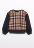 Buzo cuello redondo. Pieza frontal de cuadros escoceses con mangas y sección posterior negros. Diseño con botones decorativos en el hombro y cierre de botones en la espalda.