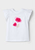 Camiseta de manga corta para niña con cuello redondo, confeccionada en suave algodón elástico para máxima comodidad. Decorada con detalles únicos como apliques, bordados, frunces, glitter y serigrafía, presenta un delicado motivo floral que aporta frescura y estilo a cualquier look.