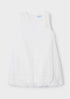 Vestido sin mangas para niña en bambula fluida, con cuello redondo, forro interior y cierre con botón oculto para mayor comodidad. Bajo elástico y lazo decorativo aportan un toque delicado. Un diseño elegante y sofisticado, ideal para ceremonias y ocasiones especiales.