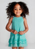 Vestido plisado sin mangas para niña, con un delicado diseño en capas y textura fluida que aporta movimiento y elegancia. Decorado con volantes en el bajo y un encantador lazo en la espalda, este vestido destaca por su frescura, suavidad y sofisticación. Ideal para ocasiones especiales, con un aire romántico y moderno que enamora a simple vista.