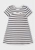 Vestido de manga corta para niña con cuello redondo y corte alto que realza la silueta. Confeccionado en tejido ligero con estampado de rayas y delicadas aberturas decorativas. Un diseño fresco y moderno para looks de verano con un toque chic.