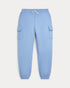 Jogger tipo cargo color azul claro, elaborado en suave felpa de mezcla de algodón, combinan un diseño deportivo con detalles utilitarios para un estilo versátil y sofisticado. Presentan cintura ajustable con cordón de punto acanalado, bolsillos delanteros en ángulo y bolsillos cargo en cada muslo, además de puños elásticos que aportan comodidad. El toque distintivo lo añade el emblemático Pony multicolor bordado en la cadera, sello inconfundible de Polo Ralph Lauren.