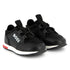 Zapatillas color negro elaboradas en una mezcla de malla transpirable y cuero de origen animal, presentan el logo impreso en el lateral y en la parte trasera, reflejando el carácter distintivo de la marca. Incorporan cierre elástico para facilitar la postura, forro interior textil y una plantilla de microfibra respirable y antibacteriana.