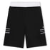 Bermuda negra de piqué con cintura elástica en contraste, bolsillos laterales funcionales, bandas de chevrón en los laterales, logotipo "BOSS" bordado en el lateral y etiqueta en la parte posterior.
