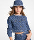 Chaqueta en denim azul oscuro para chica. Logotipo MK Empire en láser por toda la prenda. Cuello deshilachado, cierre con botones frontales Michael Kors dorados. Diseño chic, moderno y en tendencia. Prenda Must Have De Temporada.