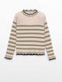 Delicado suéter acanalado con rayas en contraste, cuello cisne con diseño desagujado a tono con los puños y el bajo, y sutil logotipo metálico de la marca. Una prenda versátil y femenina, ideal para crear looks únicos y elegantes.