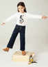 Jeans en denim oscuro con silueta amplia, cintura con elástico interno ajustable, bolsillos parches frontales, cierre con botones.