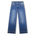 Jeans en denim color azul para niña. Diseño casual y moderno con silueta suelta. 5 bolsillos, con marca de goma en parte posterior. Botas si dobladillo con desgastes.