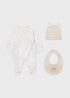 Incluye un babero con cierre mediante un único botón a presión, con bordado decorativo como detalle de adorno. Inckuye un gorro a juego, con aplique de orejitas, presentado en una caja de la línea Newborn, perfecta para regalar en ocasiones especiales.