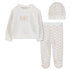 Conjunto en tejido suave con cárdigan, pantalón y gorrito. El cárdigan, en color sólido, lleva botones marcados al costado y jacquard “MK Empire” en el frente. El pantalón y el gorro completan el look con el mismo jacquard distintivo para un acabado elegante y acogedor.