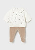 Conjunto de dos piezas para recién nacida, con buzopara recién nacida. Cuello bebé. Cierre con botones a presión en la parte posterior. Diseño con volante en el bajo de la prenda. Elementos de adorno: aplique floral bordado. Pantalón con pies tipo polaina. Cinturilla elástica.